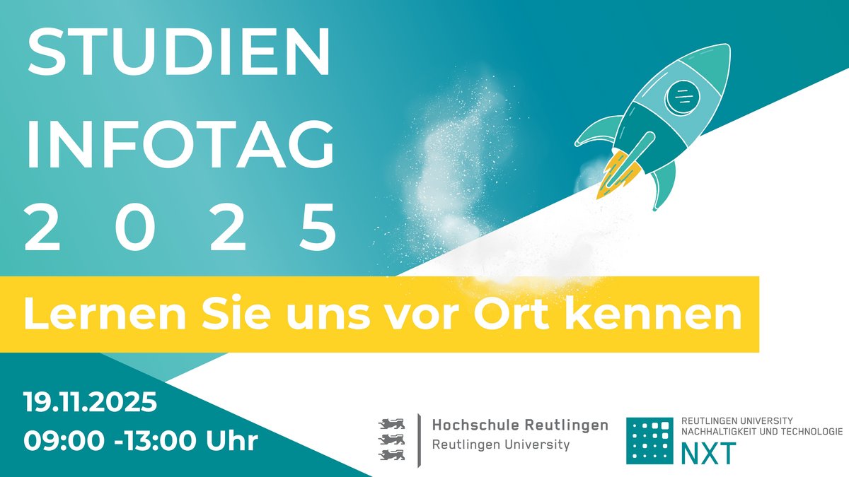 Wir laden Sie herzlich dazu ein, die Fakultät NXT Nachhaltigkeit und Technologie am 19.11.2025 vor Ort an der Hochschule Reutlingen kennenzulernen. Erkunden Sie unsere Räumlichkeiten und den Campus, sprechen Sie mit Studierenden und erfahren Sie mehr über unsere Studiengänge. Neben allgemeinen Fragen zum Studium beantworten wir Ihnen zudem natürlich auch gerne all Ihre Fragen zur Wohnraumsuche, zu unserem „Student for a Day"-Programm, zu Schnuppervorlesungen oder zum Bewerbungsverfahren. Kommen Sie hierfür gerne in das Foyer von Gebäude 16, wo Sie sich von 9:00 Uhr bis 13:00 Uhr mit unserer Studiengangsberatung unterhalten können. Für den Studieninfotag brauchen Sie sich nicht anzumelden. Sehen Sie sich unser Programm an und entscheiden selbst, was für Sie von Interesse ist. Falls Sie vorab noch etwas wissen möchten, schreiben Sie uns gerne eine Mail an NXT@reutlingen-university.de. Wir freuen uns bereits auf den gemeinsamen Tag mit Ihnen!